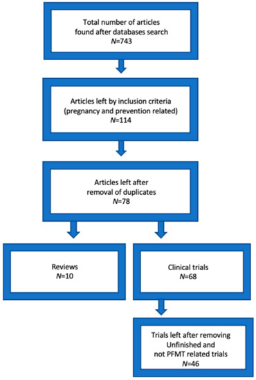 By using “woman pelvic floor rehabilitation” in the PubMed database and using a systematic review filter, 92 articles from the period from 1998 to 2020 were found. Only 9 of them met the criteria. There were 380 clinical trials found, using clinical trial filter from 1984 to 2020 period. 51 of them were prepartum, delivery or postpartum-related.