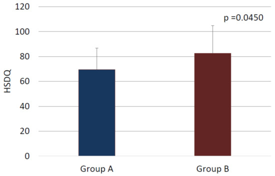 Comparison of depressed patients with mild or no urological symptoms (Group A, n = 70) and depressed patients with moderate or severe urological symptoms (Group B, n = 32) in terms of the sleep quality based on HSDQ.