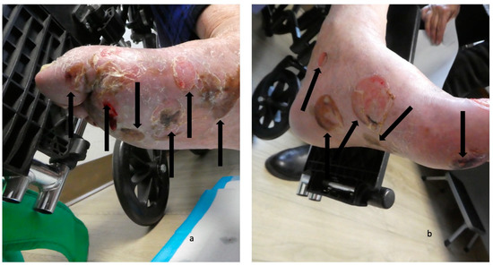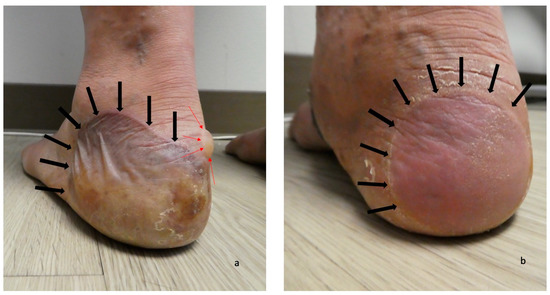 Blisters on the feet of a man with dyshidrosiform bullous pemphigoid. The plantar and medial surfaces of the right foot (a) and left foot (b) of a 65-year-old man with dyshidrosiform bullous pemphigoid show numerous flattened and deroofed blisters (black arrows). The figure and legend were originally published in Cureus under the Creative Commons (CC-BY): https://creativecommons.org/licenses/ on 11 January 2020 (Cohen PR: Dyshidrosiform bullous pemphigoid: Case reports and review. Cureus. 2020 Jan 11:12(1):e6630) and are republished with permission.