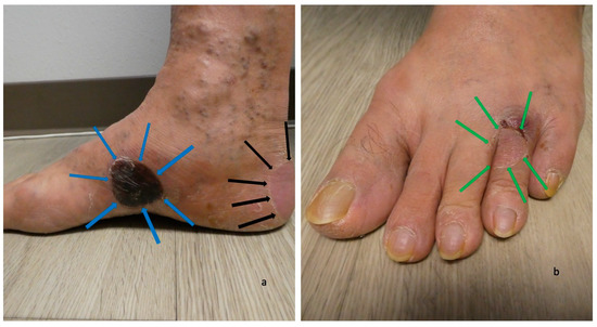 Blisters of dyshidrosiform bullous pemphigoid on the feet. A black-roofed and flattened blister on the instep (outlined in blue arrows) and another flattened blister that is primarily on the posterior heel and extends to the plantar foot (outlined in black arrows) on the medial foot (a) of a 61-year-old man. A deroofed blister is on the proximal fourth toe (outlined in green arrows) of the left dorsal foot (b). The figure and legend were originally published in Cureus under the Creative Commons (CC-BY): https://creativecommons.org/licenses/ on 11 January 2020 (Cohen PR: Dyshidrosiform bullous pemphigoid: Case reports and review. Cureus. 2020 Jan 11:12(1):e6630) and are republished with permission.