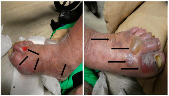 Dyshidrosiform bullous pemphigoid presenting as plantar blisters. Hemorrhagic and deroofed blisters (black arrows) on both the dorsal and lateral surface of the right foot (a) and left foot (b) of a 65-year-old man; some of the blisters extend to the soles. The figure and legend were originally published in Cureus under the Creative Commons (CC-BY): https://creativecommons.org/licenses/ on 11 January 2020 (Cohen PR: Dyshidrosiform bullous pemphigoid: Case reports and review. Cureus. 2020 Jan 11:12(1):e6630) and are republished with permission.