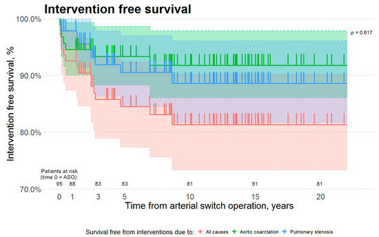 Kaplan–Meier survival estimates. The red curve represents survival free from interventions due to all causes. The green curve represents survival free from interventions due to aortic arch obstruction. The blue curve represents survival free from interventions due to neo-pulmonary artery stenosis. There is no statistically significant difference in survival free from interventions due to aortic arch obstruction vs. neo-pulmonary artery stenosis (Kaplan–Meier Log-Rank p-value is 0.617). Y-axis scale was altered to a range from 70% to 100%. Abbreviations: ASO—arterial switch operation.