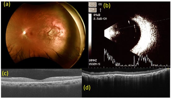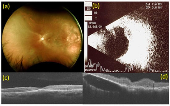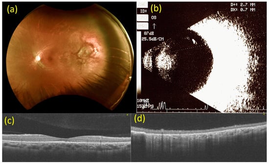 Images at baseline. (a) Fundoscopy at baseline. Multiple white-yellowish spot lesions at the fovea with multiple irregular, ill-defined white lesions at 2 to 3 o’clock on the peripheral side in the left eye. (b) B-mode ultrasonography at baseline. A choroidal mass with an extension of 7.4 × 3.8 mm on the superior temporal side in the left eye. (c) Macular optical coherence tomography (OCT) scan at baseline. Subretinal elevated solid lesion at the fovea in the left eye. (d) OCT scan of choroidal mass at 2 to 3 o’clock on the peripheral side in the left eye at baseline. Subretinal fluid collection at 2 to 3 o’clock on the peripheral side in the left eye.
