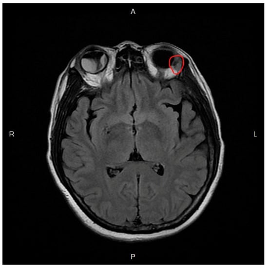 T2-weighted magnetic resonance image demonstrates retinal detachment in the right eye and a lesion on the temporal side with orbital rim enhancement in the left eye (red circle).