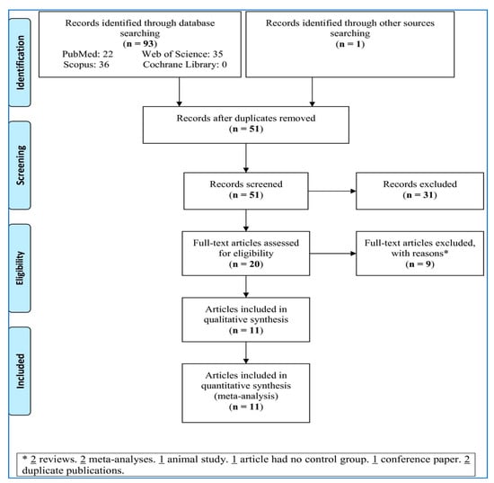 To search four main databases and other sources, 94 records were retrieved (Figure 1). After removing duplicates and irrelevant records, 20 full-text articles evaluated for eligibility; 9 full-texts papers were excluded with reasons (2 reviews, 2 meta-analyses, 1 animal study, 1 had no control group, 1 conference paper, and 2 duplicate publications). Accordingly, 11 articles were selected for the meta-analysis.