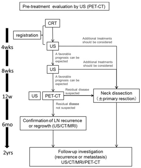 Figure 1 shows a schematic diagram of the protocol of this study. We performed US at 4 and 8 weeks after CRT. In cases in which we judged that additional treatment should be considered, neck dissection was performed. At 12 weeks after CRT, US and PET-CT was performed. We performed neck dissection and primary dissection as necessary it was judged, based on the PET-CT results, that additional treatment should be considered. In operative cases, we evaluated the lymph nodes that were subjected to a pathological examination. In observation cases, patients were observed for at least six months to detect recurrence at the lymph nodes. Patients were followed for 2 years after CRT.