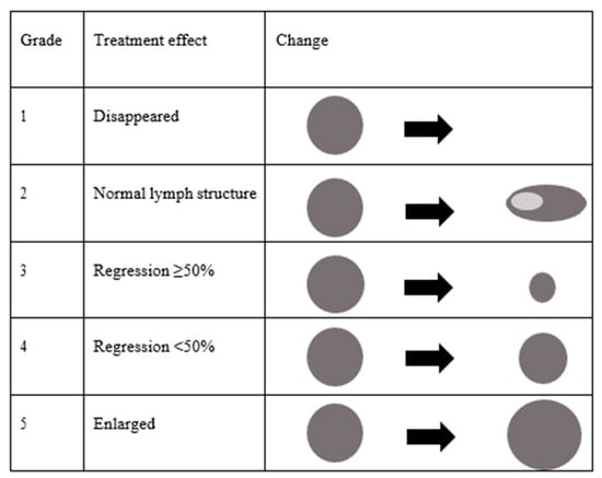 Grade 3: Metastatic lymph nodes regressed ≥50%.