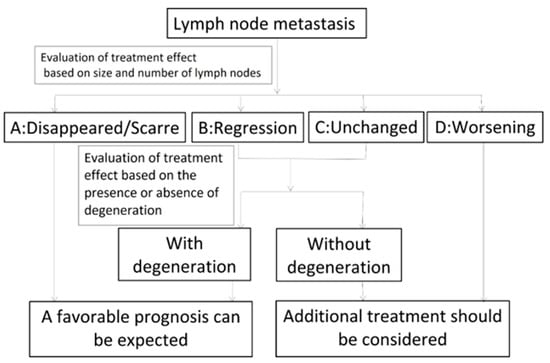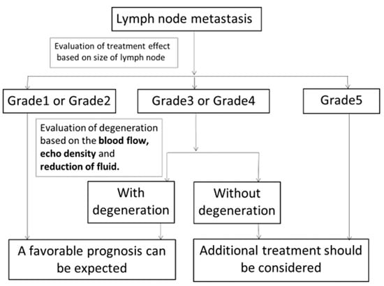 New diagnostic criteria for “Evaluation of the effects of treatment on metastatic cervical lymph nodes using ultrasonography”. After CRT, the effects of treatment on metastatic lymph nodes were evaluated based on size change. Patients with grade 1 or 2 lymph nodes were expected to have a favorable prognosis. Additional treatment should be considered for patients with grade 5 lymph nodes. Grade 3 or 4 lymph nodes were evaluated further to determine whether they showed degeneration based on the disappearance of blood flow, change of echo density to high and the disappearance of fluid. Patients with lymph node degeneration were expected to show a favorable prognosis. Additional treatment should be considered for patients with lymph nodes without degeneration.