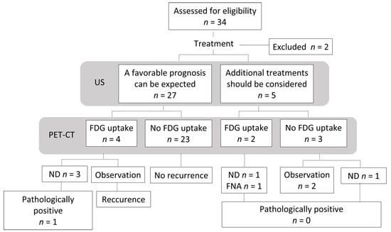 Flowchart of the study population. US, Ultrasonography; PET-CT, 18F-2-fluorodeoxyglucose-positron emission tomography with computed tomography; FDG, fluorodeoxyglucose; ND, neck dissection; FNA, fine needle aspiration cytology.
