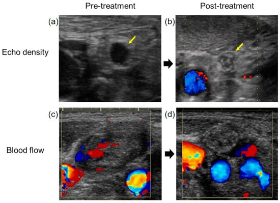 The evaluation of the treatment effect on metastatic lymph nodes. (a) The echo density of the metastatic lymph node was low before treatment. (b) The echo density changed to high after treatment (yellow arrow). (c) The blood flow of metastatic lymph node observed before treatment. (d) The blood flow to the metastatic lymph nodes disappeared after CRT.