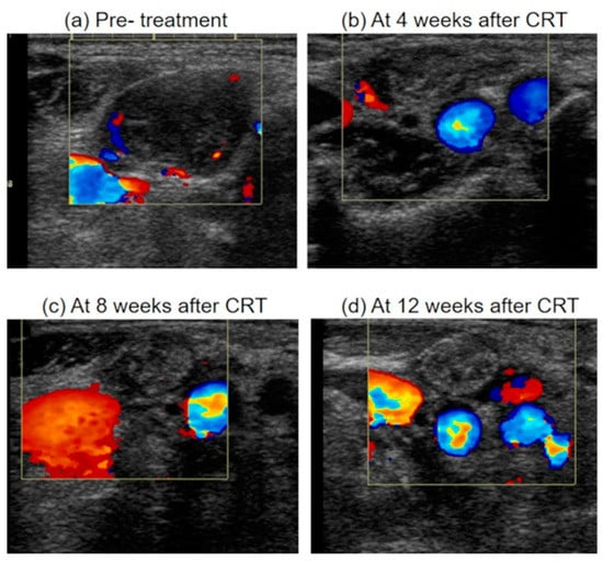 Ultrasonographic appearance of metastatic lymph node after chemoradiotherapy. (a) A metastatic lymph node before treatment, which was enlarged, inhomogeneity, hypoechoic and with blood flow from areas other than the hilum. (b) The metastatic lymph node regressed <50% (Grade 4) at 4 weeks after CRT. The echo density of lymph node was isoechoic. The blood flow from areas other than the hilum was decreased (c) The metastatic lymph node regressed ≥50% (Grade 3) at 8 weeks after CRT. The blood flow from areas other than the hilum was further decreased. (d) The metastatic lymph node regressed ≥50% (Grade 3) at 12 weeks after CRT. The blood flow from areas other than the hilum was disappeared. And the echo density of lymph node was high. CRT, chemoradiotherapy.
