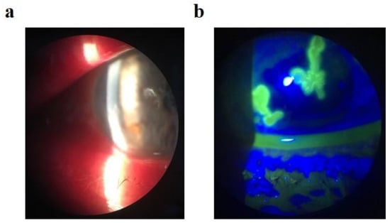 A representative image of herpetic keratitis in the five described cases. (a) Slit-lamp examination with herpetic lesion. (b) Slit-lamp examination with fluorescein dye and blue light, showing typical corneal dendritic lesions.