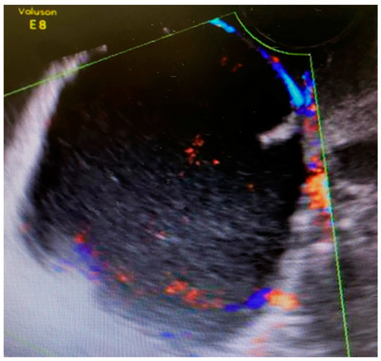 The first 12-week ultrasound showed 66 mm × 48 mm cysts between the bladder and the cervix with peripheral vascularization, and another left paracervical cystic and heterogeneous lesion of 39 mm × 26 mm size (Figure 1). A follow-up visit was indicated requiring close monitoring.