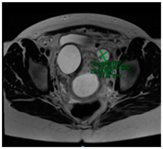 The MRI (Magnetic Resonance Imaging) scan showed 53 mm × 46 mm thin-walled cysts with a septum in the right paracervical area, another 27 mm × 20 mm cystic formation in the left hemipelvis (Figure 2 and Figure 3) and presacral 2 cm cysts containing a solid pole.