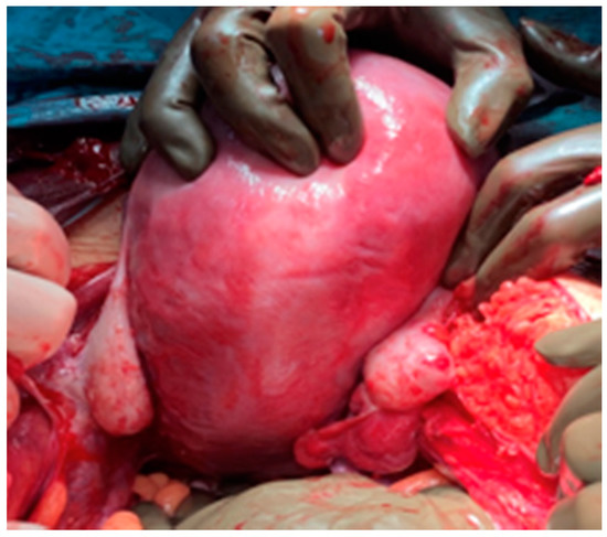 During surgery, both ovaries and fallopian tubes appeared macroscopically healthy (Figure 4). An implant of 2 cm size was found in the anterior uterine wall (Figure 5) and another implant of smaller size was found in the pouch of Douglas. It was also observed a 2 cm size cyst located between the anterior uterine wall and vesical fold. Rest of the abdominal cavity was normal. Concordant results were obtained at intraoperative biopsy, so complete surgical excision was carried out to remove the abovementioned cyst. Total extrafascial hysterectomy, double adnexectomy and omentectomy were also performed as per the standard protocol without any incidents. Postoperative course was favourable and patient was discharged from hospital 5 days later.