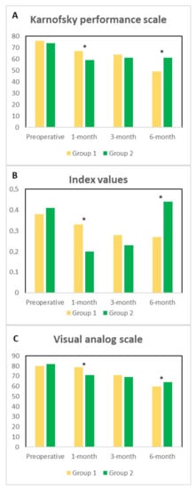 Panel (A). Preoperative, at 1-, 3- and 6-month Karnofsky performance scale among the groups of patients is described. Panel (B). Preoperative, at 1-, 3- and 6-month Index values among the groups of patients is described. Panel (C). Preoperative, at 1-, 3- and 6-month Visual analog scale among the groups of patients is described. The significances among the groups are depicted with asterisks.