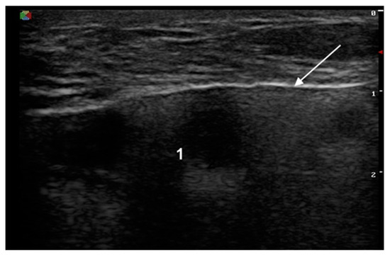 Signs of a ruptured implant on ultrasound: white arrow—abnormal shell (one white line is visible); 1—inhomogeneous content.