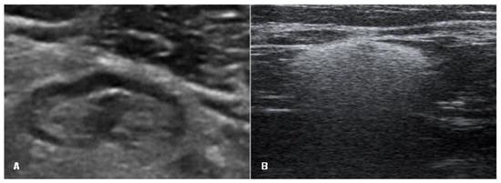 US examination signs of an intact and a ruptured breast implant were chosen with reference to literature and examined breast implants were divided into two groups—intact and ruptured [23,24]. An intact breast implant was characterized by an even and continuous implant shell and homogeneous intracapsular echotexture (Figure 1).