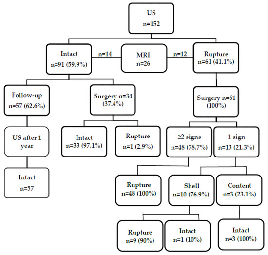 A total of 76 women with 152 silicone breast implants were reviewed in this study (Figure 4). The age of the patients ranged between 23 and 60 years; the mean age was 37 years (SD, 0.61). On a US examination, there were 91 intact implants (59.9%), and 61 implants (41.1%) were found or were suspected to be ruptured. Implant replacement surgery was performed in 62.5% (n = 95) of the cases (37 implants were intact and 58 were ruptured), and in the remaining 37.5% (n = 57) of the cases, no surgery was performed. Intact implants were found in 61.8% of cases (n = 94), and 58 implants were ruptured (38.2%). The majority (79.3%, n = 46) of implant ruptures were intracapsular, and the rest (20.7%, n = 12), extracapsular (with axillary lymph nodes containing silicone). Normal lymph nodes were found in 90.8% (n = 138), and lymph nodes with silicone-containing features were found in 9.2% (n = 14) of all cases.