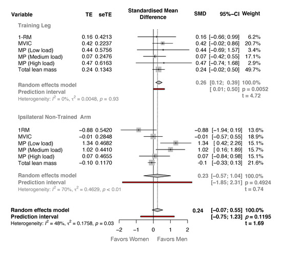 where r is the average correlation coefficient between the pre and post measurements in both sexes. The correlation coefficient between pre-post measurements for both sexes was computed from the standard deviation of change score (SDdiff) in each sex condition. The SCMD was considered trivial (<0.20), small (0.20–0.59), moderate (0.60–1.19), large (1.20–1.99), and very large (>2.00) [27]. Variance estimations between variables were calculated using a random-effects model (i.e., Hartung–Knapp/Sidik–Jakman adjustment (HKSJ)) with a 95% confidence interval (CI95%). The consistency of the effects found was assessed using the heterogeneity (I2) and Tau-square tests (τ2) tests, with I2 being considered small (<25%), moderate (25–49%), and high (>50%). In addition, τ2 and prediction interval (PI) were included because τ2 cannot readily point to the clinical implications of the unobserved heterogeneity [28]. The prediction interval allows a better clinical evaluation of the results obtained because it represents the range in which the effect size of a future study conducted on the topic will most likely be (i.e., probability of true-positive effect). Prediction intervals and the probability of the true-positive effects calculations were performed in accordance with previous studies [28].