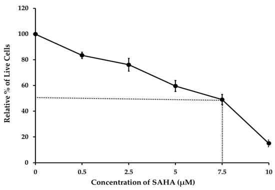 To determine whether the HDACI (SAHA) was inhibiting the growth of A2780 cells, we first assessed cell viability using the TBDE method. The results indicated that even though the cytotoxic effect started with a 0.5 μM concentration of SAHA, the treatment with 7.5 μM of SAHA was able to induce 50% cell death within 24 h (Figure 1). This experiment also demonstrated that 10 μM of SAHA caused nearly 80% of cell death compared to the control after 24 h of treatment. From this assay, the IC50 value of SAHA was calculated to be 7.5 μM for A2780 cells.
