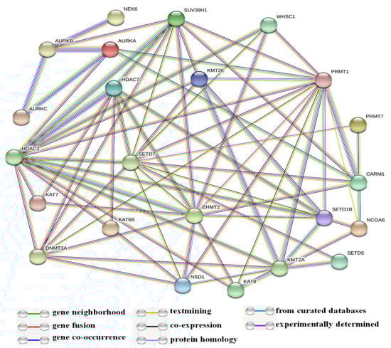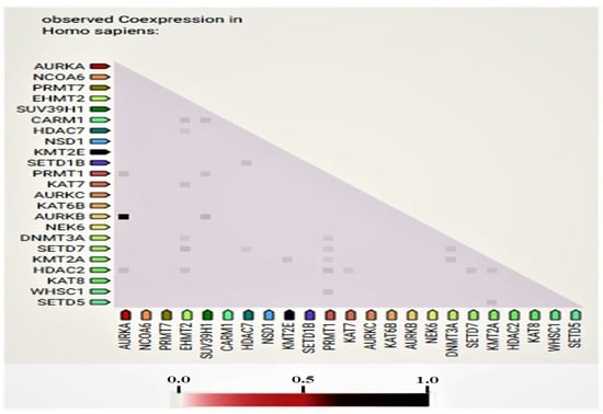 In this study, some of the genes with a vital regulatory role in the epigenetics pathways and interactions with other genes were correlated using the online software STRING (Figure 3) for the network analysis. A total of 23 genes, including SETD1B, HDAC7, NSD1, DNMT3A, WHSC1, AURKA, EHMT2, KAT7, SUV39H1, NCOA6, SETD7, PRMT7, CARM1, KAT8, KMT2E, NEK6, KMT2A, KAT6B, SETD5, AURKC, AURKB, PRMT1, and HDAC2, were found to be prominently down-regulated. The network analysis revealed strong associations between AURKB, AURKA, and AURKC based on the experimentally determined data, gene co-occurrence, and gene co-expression status gathered from curated protein homology databases. On the other hand, SUV39H1 showed associations with AURKB, DNMT3A, PRMT1, CARM1, KMT2E, EMHT2, SETD7, HDAC2, and HDAC7. Additionally, PRMT1 and HDAC2 displayed a strong association with many of the down-regulated genes in this study. In the co-expression analysis, AURKB exhibited a strong correlation with AURKA, with a score of 0.925. In addition, DNMT3A was found to be co-expressing with EMH2 (0.045) and PRMT1 (0.045); the scores were measured based on protein regulation. Furthermore, SUV39H1 also showed an RNA co-expression score value with AURKB (0.150), PRMT1 (0.074), and CARM1 (0.085) in Homo sapiens. Thus, the network and co-expression analysis of the genes altered during SAHA treatment showed a strong network. Therefore, further exploring their relationships could lead to a better understanding of their mechanistic importance in the context of epigenetic alterations following HDAC inhibition (Figure 3 and Figure 4).