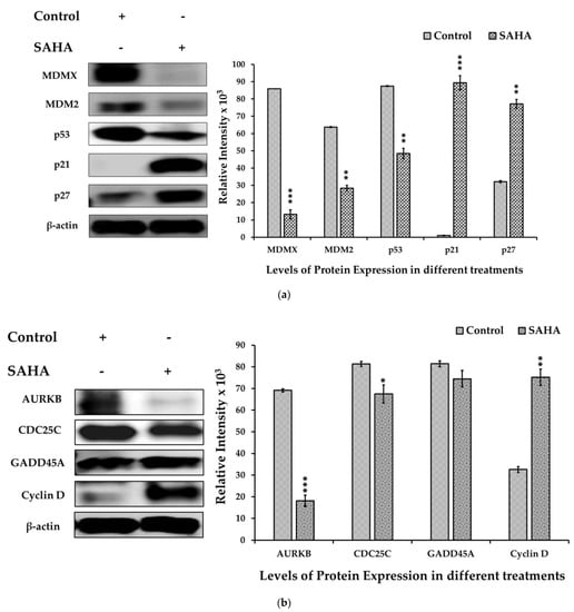 After 24 h of SAHA treatments, the cells were lysed on ice for 30 min in radio-immunoprecipitation assay (RIPA) buffer with protease inhibitor cocktail and sodium orthovanadate (Santa Cruz Inc., Dallas, TX, USA) for protease and phosphatase inhibitions, respectively. According to the manufacturer’s instructions, the protein concentrations were assayed using the bicinchoninic acid (BCA) method (Thermo Fisher Scientific, Grand Island, NY, USA). For immunoblotting analysis, 25 μg of total cellular protein per lane were separated by 7.5, 10, 12, and 15% of SDS-PAGE and electrophoretically transferred onto NC membranes. After blocking with 5% skim milk powder in PBS with 0.3% Tween 20, the membranes were probed with specific primary antibodies for MDMX; MDM2; p53; p21WAF1/CIP1; p27Kip1; AURKB; CDC25C; GADD45A; cyclin D; acetyl form of H2A, H2B, H3, and H4; HDAC2; HDAC3; HDAC4; DNMT3A; PRMT1; SUV39H1; and β-actin. Finally, the detection of specific protein bands on the membranes was achieved using the enhanced chemiluminescent (ECL) reagent with a suitable substrate (Milford). The protein bands were imaged immediately using a UVP image analyzer (EC3 Chemi HR 410 Imaging System). The densitometric analyses were completed using the ImageJ (NIH, Bethesda, MD, USA) analysis tool.