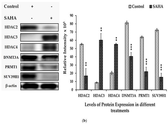 (a). Effects of SAHA on the expression of total acetyl form of histones. A2780 cells were treated with 7.5 µM of SAHA for 24 h. Western blotting was performed with the indicated level of acetylated histones such as H2A, H2B, H3, and H4. The bar graphs represent total acetylation of histones following treatment with SAHA, as determined by densitometry of bands. All data are presented as the mean ± SD of at least 3 independent experiments. *** p < 0.001. (b). Effects of SAHA on the expression of HDACs and DNMTs/HMTs in A2780 cells. Western blotting was performed to determine the levels of HDAC2, HDAC3, HDAC4, DNMT3A, PRMT1, and SUV39H1. The bar graphs represent HDACs and DNMTs/HMTs following treatment with SAHA, as determined by densitometry of bands. All data are presented as the mean ± SD of at least 3 independent experiments. ** p < 0.01; *** p < 0.001.