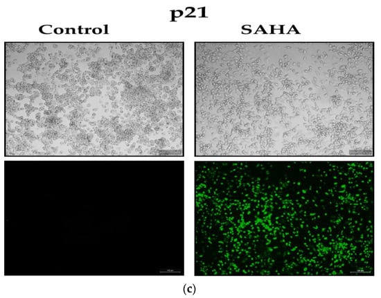 - Huang, L.; Sowa, Y.; Sakai, T.; Pardee, A.B. Activation of the p21WAF1/CIP1 promoter independent of p53 by the histone deacetylase inhibitor suberoylanilide hydroxamic acid (SAHA) through the Sp1 sites. Oncogene 2000, 19, 5712–5719. [Google Scholar] [CrossRef]