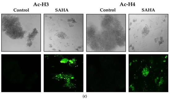 In regard to the acetylated histone levels in cells growing as spheroids, we were able to obtain results similar to the A2780 cells that were growing as monolayers. As shown in Figure 8b,c, after SAHA treatment, we were able to observe high levels of acetyl H2A, H2B, H3, and H4 in almost all the cells that had formed spheroids.
