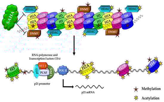 In HDAC inhibitor-treated cancer cells, SAHA helps to augment acetylation, which leads to increased acetylation and decreased methylation of histones. These histone modifications induce higher levels of p21WAF1/CIP1 expression in A2780 cancer cells. Upon further stimulation (ex: hyperacetylation), activation of p21WAF1/CIP1 gene transcription results in a prolonged retention of cancer cells’ epigenetic alterations.