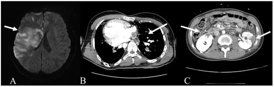 Multiple embolic events occurred in our patient, including (A) acute right middle cerebral artery territory infarction on magnetic resonance imaging, (B) pulmonary thromboembolism, and (C) multifocal renal infarctions on computed tomography.