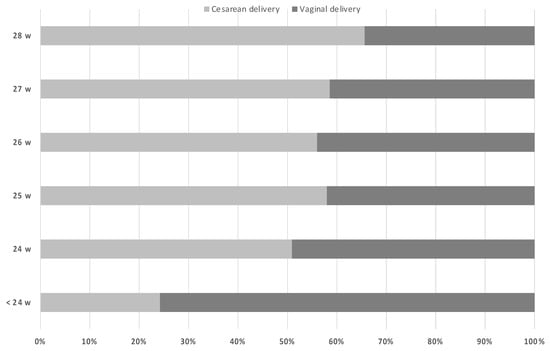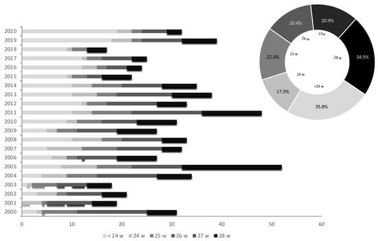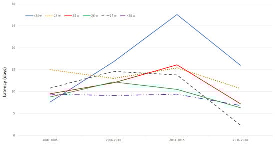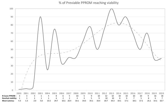 - González-Mesa, E.; Herrera, J.A.; Urgal, A.; Lazarraga, C.; Benítez, M.J.; Gómez, C. Temporal trends of latency period and perinatal survival after very early preterm premature rupture of fetal membranes. Arch. Gynecol. Obstet. 2012, 286, 347–352. [Google Scholar] [CrossRef] [PubMed]