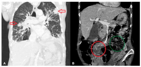 Lymphomatous infiltration of the lungs (indicated by arrows) (A), and of the mesentery of the small intestine (in the red circle); the right mesentery is shown in the green circle (B).