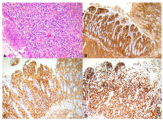Unfortunately, the patient died on the twenty-seventh day of hospitalization due to progressive respiratory failure. The specimens from the bladder fistula operation were histopathologically re-evaluated, revealing a malignant lymphoma of the small intestine (Figure 2A–D).