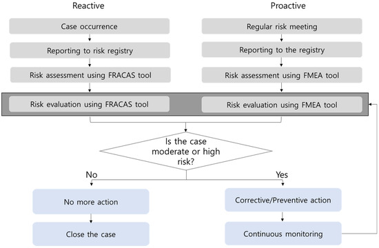 The concept flow diagram for a continuous and practical risk management system is shown in Figure 1. For example, if a failure occurs for a reactive management case, the person in charge of that failure reports it to the risk registry tool. After that, risk assessment and evaluation were performed by the risk management team using the FRACAS tool. The risk management team consisted of the person in charge of that failure, the QI team manager, the laboratory manager, and the director of laboratory medicine. If the case is low-risk, no additional action is required, but it is continuously monitored after conducting high-risk surface corrective action. RPNs above 20 were designated as high-risk, 10 to 20 as moderate-risk, and less than 10 as low-risk. For the FMEA branch, risk meetings for each testing unit were held several times to find possible failure modes and report them to the registry. Thereafter, risk assessment and evaluation were performed by the risk management team using the FMEA tool. The subsequent process is the same as that for the FRACAS branch.