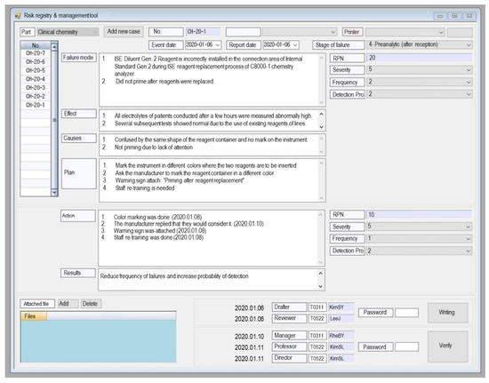 Risk management-related requirements have recently been added to laboratory accreditation checklists of the Laboratory Medicine Foundation (LMF) in Korea [6]. Risk management is also emphasized by the International Society for Quality in Health Care (ISQua), an organization that certifies laboratory certification institutions, stating that “A risk management framework could include: a list of identified risks—strategic, operational and financial” [4,7]. To prepare these well, it is important to develop and utilize well-designed and effective tools in the laboratories. Many laboratories have yet to apply effective risk management systems for practical management. Recent studies on ‘risk management’ in the laboratory cover a wide variety of topics, including patient safety issues caused by laboratory errors [8,9,10,11,12,13,14]; however, they do not provide any practical risk management tool optimized for clinical laboratories. Additionally, there is no commercially available risk management package that can be easily used in the clinical laboratory.