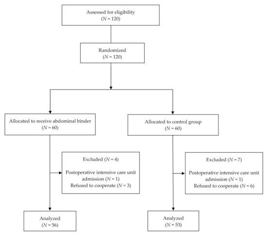 - Arici, E.; Tastan, S.; Can, M.F. The effect of using an abdominal binder on postoperative gastrointestinal function, mobilization, pulmonary function, and pain in patients undergoing major abdominal surgery: A randomized controlled trial. Int. J. Nurs. Stud. 2016, 62, 108–117. [Google Scholar] [CrossRef] [PubMed]