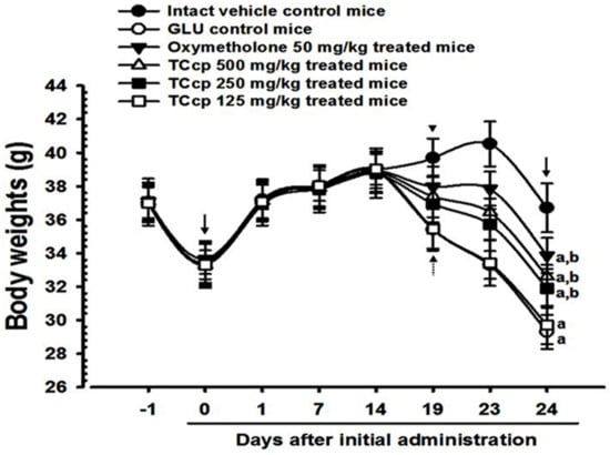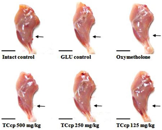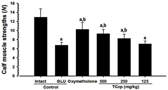 In this study, a 24 day-experimental period showed normal body weights for all mice in the intact vehicle-control group. GLU treatment decreased the body weight gains which could be due to the cachexia induced by potent catabolic effects of GLU []. The body weight increases noted in mice treated with TCcp (500 and 250 mg/kg) may be related to the antioxidative and anti-inflammatory effects of TCcp [,]. Generally, enhanced immune system of animals leads to good growth patterns []. Oxymetholone, a typical 17α-alkylated anabolic-androgenic steroid, may inhibit the GLU-induced catabolic cachexia-related decreases in body weights due to its strong anabolic effects []. High doses of GLU can cause catabolic muscular atrophy which is described by the degradation and reduction of proteins, production of muscle strength, decreased fiber diameter, and resistance to fatigue [,,]. In this study, decreased calf thickness was noted after five days of initial treatment with DEXA. Furthermore, decreased muscle strength of calf weight at sacrifice, and gastrocnemius muscle thickness was observed which could be due to the catabolic muscular atrophy. Inhibition of GLU-induced gastrocnemius muscle thickness, calf muscle thickness and strength, and decreases in weights after oral administration of TCcp (500 and 250 mg/kg), and oxymetholone (50 mg/kg) indicate that TCcp enhanced the GLU-stimulated atrophic changes in calf muscle.