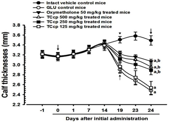Nineteen days after the first treatment, significant (p < 0.01) decreases in calf thicknesses in GLU control mice were observed as compared to the intact control. Significant decreases (p < 0.01) in calf thickness after day 10 and day 24 of DEXA treatment were observed in GLU control mice compared with the intact vehicle control. Conversely, the decreases in calf thickness were significantly (p < 0.01) and dose-dependently inhibited by TCcp (500 and 250 mg/kg) treatments after day 5 of the first DEXA treatment. Significant (p < 0.01) increases in calf thickness during 10 days of DEXA treatment and 24 days of test material administration were observed in the experimental groups compared with the intact vehicle control. In the present study, calf thickness of mice treated with oxymetholone after day 5 of the first DEXA treatment showed a significant (p < 0.01) increase as compared with the GLU control. TCcp (125 mg/kg) administered groups did not show any significant change in the calf thickness as compared with GLU control mice (Figure 2 and Figure 3).