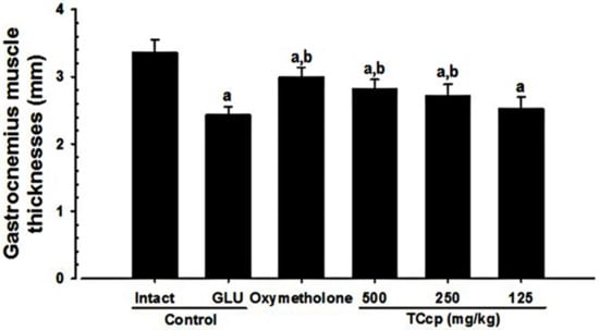 GLU control mice showed significant (p < 0.01) decreases in gastrocnemius muscle thickness after muscular exposure by removing skin as compared to the intact vehicle control. Nevertheless, mice treated with all three dosages of TCcp and oxymetholone showed significant (p < 0.01) increases in gastrocnemius muscle thickness compared to the GLU control. TCcp (500 and 250 mg/kg) dose-dependently inhibited the GLU-induced decreases in gastrocnemius muscle thickness; however, no significant variations in gastrocnemius muscle thickness were demonstrated by TCcp (125 mg/kg) as compared to the GLU control (Figure 4).