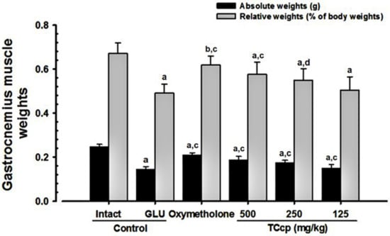 The significant (p < 0.01) decreases in the absolute wet-weight and relative weights of gastrocnemius muscle mass were observed in GLU control mice as compared to the intact vehicle control. Conversely, mice treated with TCcp (500 and 250 mg/kg) and oxymetholone exhibited significant (p < 0.01) increases in the weight of gastrocnemius muscle mass as compared with the GLU control. TCcp (500 and 250 mg/kg) dose-dependently inhibited the GLU-induced decreases in gastrocnemius muscle mass weight, but no significant changes were demonstrated by TCcp (125 mg/kg) treated mice as compared with the GLU control (Figure 5).