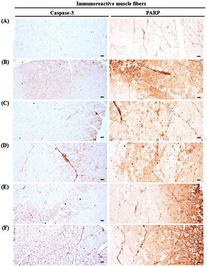 Representative gastrocnemius muscle caspase-3 and PARP-immunoreactivity. (A) Intact vehicle control (distilled water administered and treated with saline). (B) GLU control (distilled water administered and treated with DEXA). (C) Oxymetholone (50 mg/kg oxymetholone administered and treated with DEXA as reference). (D) TCcp500 (500 mg/kg TCcp administered and treated with DEXA–higher dose treated mice). (E) TCcp250 (250 mg/kg TCcp administered and treated with DEXA–middle dose treated mice). (F) TCcp125 (125 mg/kg TCcp administered and treated with DEXA–low dose treated mice). TCcp = tart cherry (Fruit of Prunus cerasus L., Rosaceae) concentrated powder. GLU = glucocorticoid. DEXA = dexamethasone. PARP = cleaved poly (ADP-ribose) polymerase. All avidin-biotin complex methods. Scale bars = 40 μm.