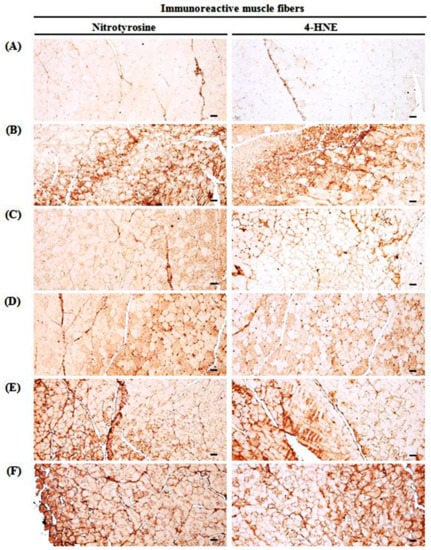 Selective gastrocnemius muscle nitrotyrosine and 4-HNE-immunoreactivities. (A) Intact vehicle control (distilled water administered and treated with saline). (B) GLU control (distilled water administered and treated with DEXA). (C) Oxymetholone (50 mg/kg oxymetholone administered and treated with DEXA as reference). (D) TCcp500 (500 mg/kg TCcp administered and treated with DEXA–higher dose treated mice). (E) TCcp250 (250 mg/kg TCcp administered and treated with DEXA–middle dose treated mice). (F) TCcp125 (125 mg/kg TCcp administered and treated with DEXA–low dose treated mice). TCcp = tart cherry (Fruit of Prunus cerasus L., Rosaceae) concentrated powder. GLU = glucocorticoid. DEXA = dexamethasone. 4-HNE = 4-hydroxynonenal. All avidin-biotin complex methods. Scale bars = 40 μm.