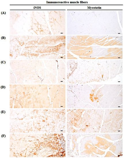 Selective gastrocnemius muscle iNOS and myostatin-immunoreactivity. (A) Intact vehicle control (distilled water administered and treated with saline). (B) GLU control (distilled water administered and treated with DEXA). (C) Oxymetholone (50 mg/kg oxymetholone administered and treated with DEXA as reference). (D) TCcp500 (500 mg/kg TCcp administered and treated with DEXA–higher dose treated mice). (E) TCcp250 (250 mg/kg TCcp administered and treated with DEXA–middle dose treated mice). (F) TCcp125 (125 mg/kg TCcp administered and treated with DEXA–low dose treated mice). TCcp = tart cherry (Fruit of Prunus cerasus L., Rosaceae) concentrated powder. GLU = glucocorticoid. DEXA = dexamethasone. iNOS = inducible nitric oxide synthase. All avidin-biotin complex methods. Scale bars = 40 μm.