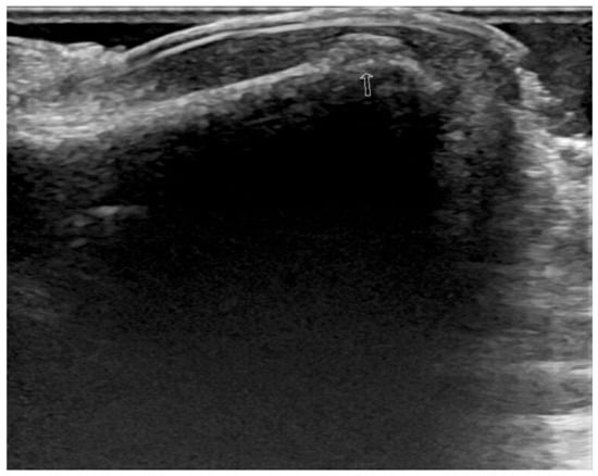 Unilateral foot ultrasonography: Cortical disruption at the dorsal aspect of right first distal phalanx (arrow).