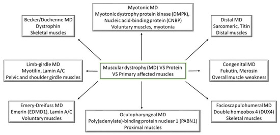 Muscular dystrophies and their primary affected proteins and muscles; (MD—muscular dystrophy).