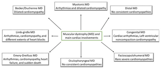 Cardiac diseases have been observed in neuromuscular disorders, distinctly muscular dystrophies [3,4,5]. However, cardiac diseases’ involvement does not relate to the severity or advancement of the disorder, and it can be either the initial symptom or even the dominating one. Sudden death and progressive heart failure are the main causes that determine cardiac death. Due to the advancement in medical management over the years, patients’ survival rate suffering from muscular dystrophy is significantly increased. However, one main aspect that contributes to mortality is cardiac involvement [2].