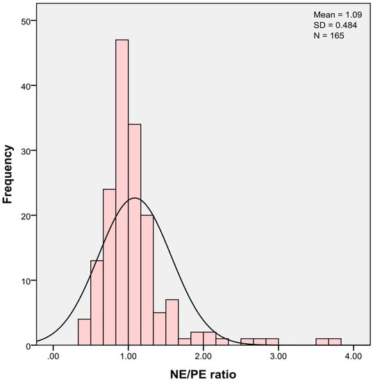 Distribution of NE/PE ratio in the sample. Abbreviations: NE/PE = negative emotionality/positive emotionality; SD = standard deviation.