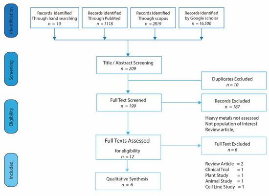 Data extraction was conducted using an extraction table. The table includes the following characteristics of the included studies: the name of the first author, the year of publication, the country in which the research took place, study design, sample type, markers assessed, method of the assessment, statistical analysis used, and number, sex, age, ethnicity, marital status, level of education, and employment status of participants. All the six included studies are cross-sectional studies, so they were evaluated using the STROBE checklist. Qualitative synthesis was conducted based on the heterogeneity in the heavy metal biomarkers and outcomes measured by the included studies. Two-tailed tests were done and p < 0.05 was considered significant for all statistical comparisons.